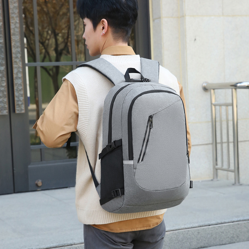 Denna ryggsäck har en enkel design och ser ut som vilken ryggsäck som helst, men den har RFID-skydd och ett USB-uttag på ena sidan. På motsatt sida finns det ett fack för vattenflaska. Insidan är vadderad och har två fack, perfekt för dokument, surfplatta eller dator. Ryggsäcken kommer också i fem olika färger: grå, röd, svart, blå och grön.